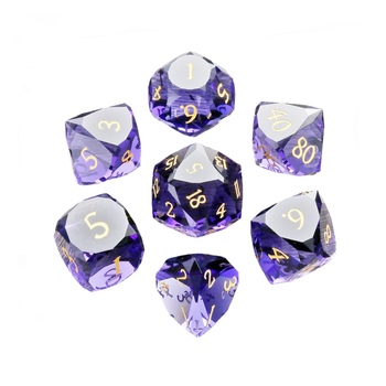 Set di dadi in vetro con prisma di pietre preziose viola, dadi DnD poliedrico con bordo affilato inciso, Set da 7 pezzi con confezione in scatola di latta di metallo