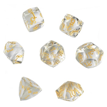 Set di dadi con pietre preziose in cristallo trasparente, prisma trasparente in vetro inciso dadi taglienti per DnD, Set da 7 pezzi con scatola di latta in metallo